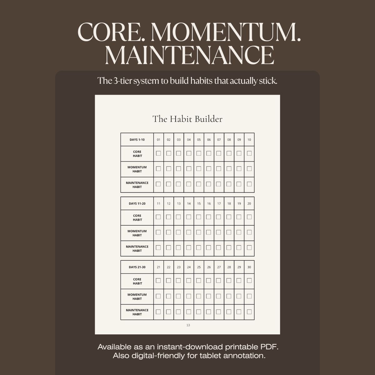 The Habit Builder: A 3-tiered tracking grid (Core, Momentum, Maintenance) to phase in your new standards.